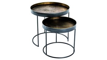 Das Beistelltisch-Set strahlt Extravaganz aus. Es setzt sich aus zwei einheitlich designten Beistelltischen in unterschiedlichen Größen zusammen. Die Maße des kleineren Tischchens betragen ca. 38 x 41 cm (HxD), während der größere Tisch ca. 48 x 51 cm (HxD) misst.