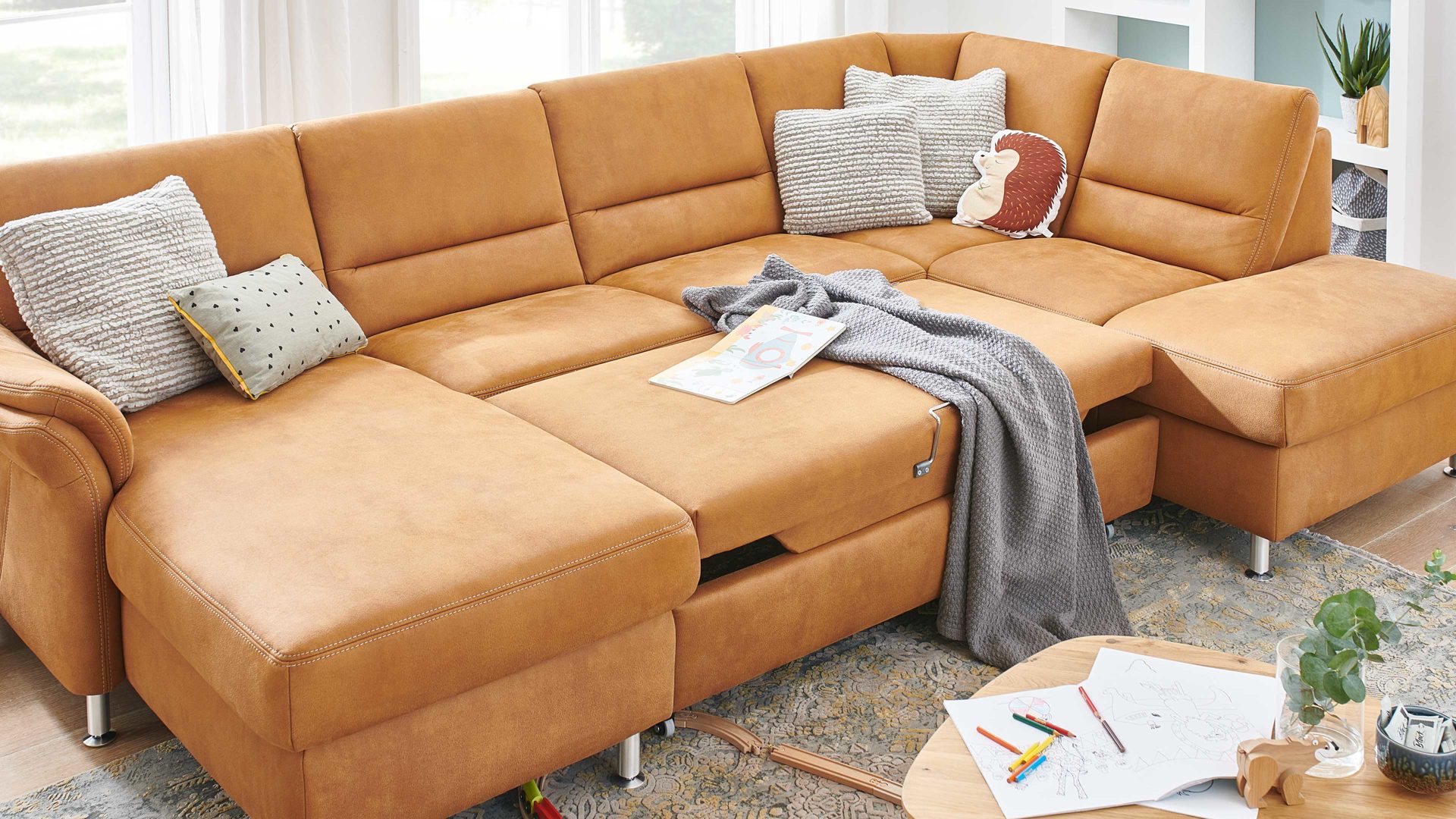 Indem Sie den Sitz nach vorne ausziehen, erweitern Sie die standardmäßige Sitzfläche um ca. 140 x 122 cm (BxL). Der Federholzrahmen, die bequeme Polsterung und die serienmäßig mit Nesselstoff oder gegen Aufpreis original bezogene Liegefläche sorgen für guten Liege- und Schlafkomfort. Als besonders praktisch erweist sich die Bettfunktion, wenn Gäste bei Ihnen übernachten.