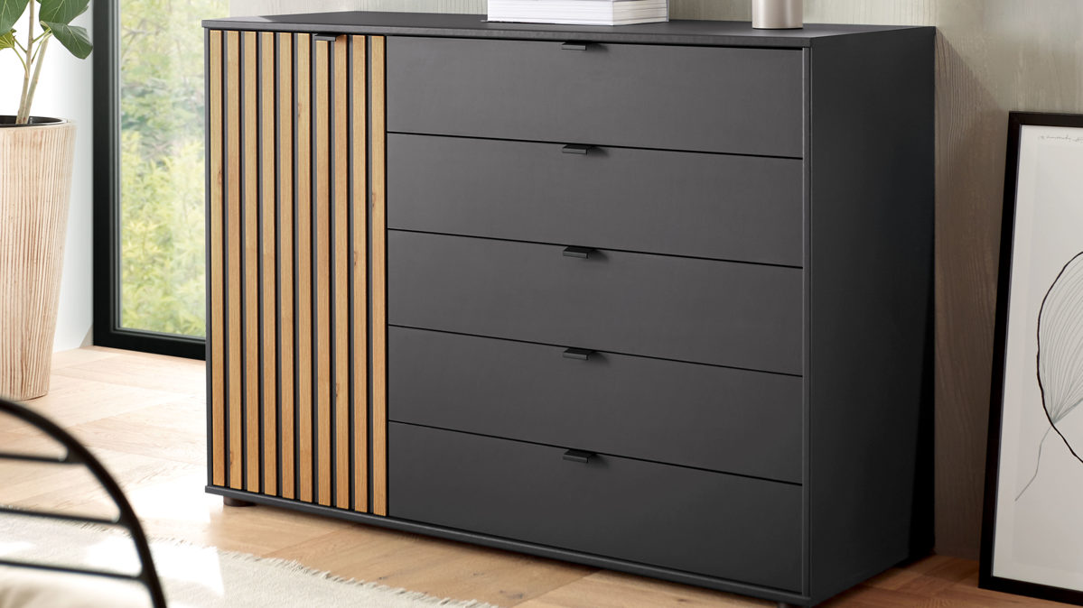 mattes Graphit, kombiniert mit biancofarbener Eiche Nachbildung und mattschwarzen Griffen