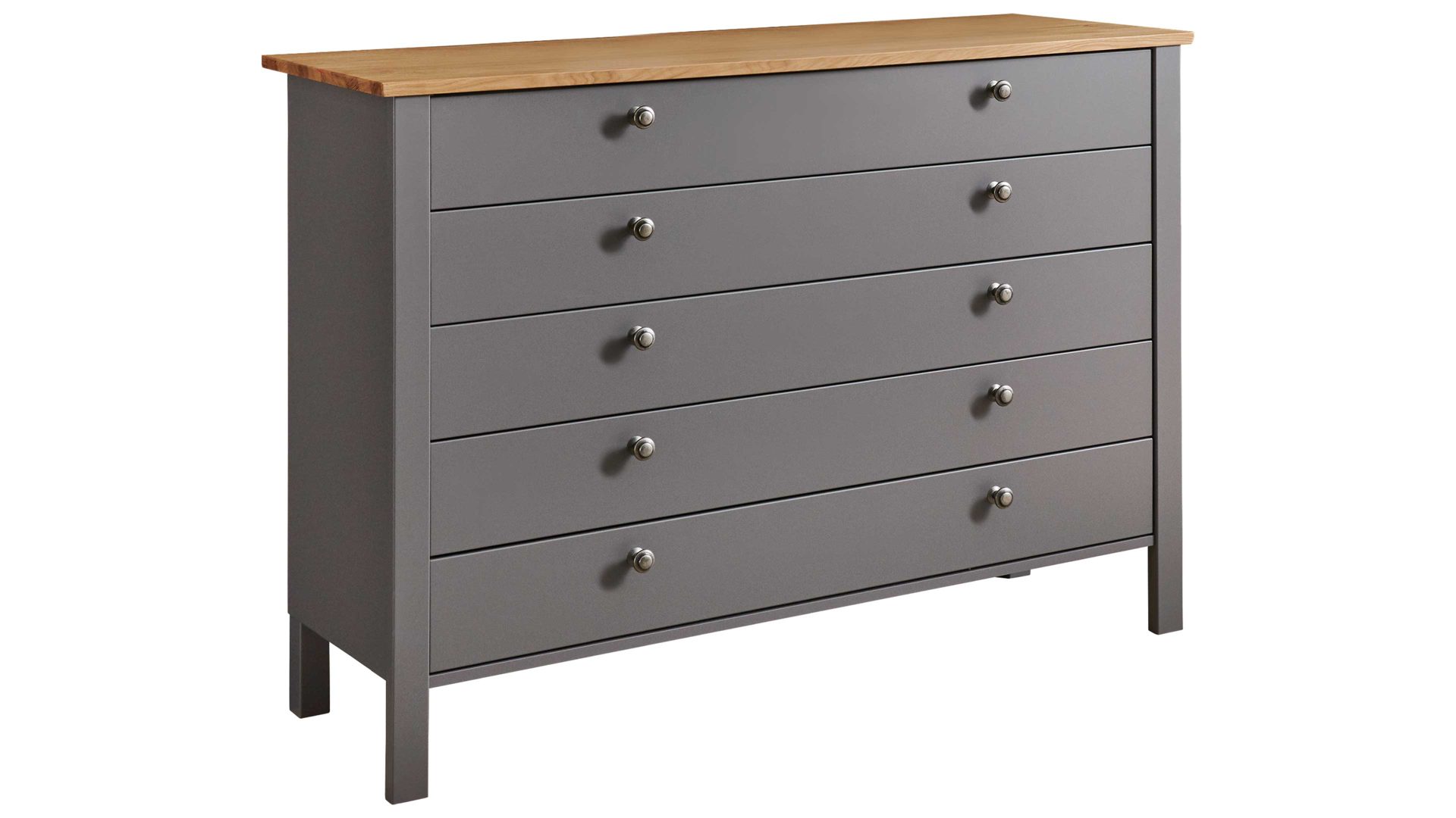 Die mattnickelfarbigen Knopfgriffe Nr. 90985 ergänzen das Design des Kommodenschranks perfekt und sorgen für eine harmonische Gesamtoptik. Mit den fünf Schubladen, die über Teilauszug und Softclose-Funktion verfügen, haben Sie genügend Stauraum für Ihre Kleidung und Accessoires. Der Selbsteinzug ermöglicht ein bequemes Öffnen und Schließen der Schubladen.