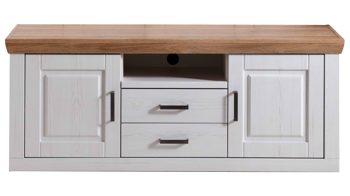 Das ca. 158 x 63 x 52 cm (BxHxT) große Medienmöbel umfasst zwei Türen mit jeweils einem Holzboden sowie zwei Schubladen und ein offenes Fach mit praktischem Kabeldurchlass. Letzteres ist ideal für einen Receiver, DVD- und/oder Blu-ray-Player. Die Drehtüren und Schubladen bieten eine Menge Stauraum für verschiedene Gegenstände, die Sie licht- und staubgeschützt aufbewahren wollen. Alle Elemente sind symmetrisch angeordnet, was dem Auge schmeichelt und dem Wohnmöbel sowie dem gesamten Raum Struktur gibt. Auf dem Oberboden hat ein TV-Gerät mit einer Größe von bis zu 55 Zoll und bis zu 74 kg Platz.
