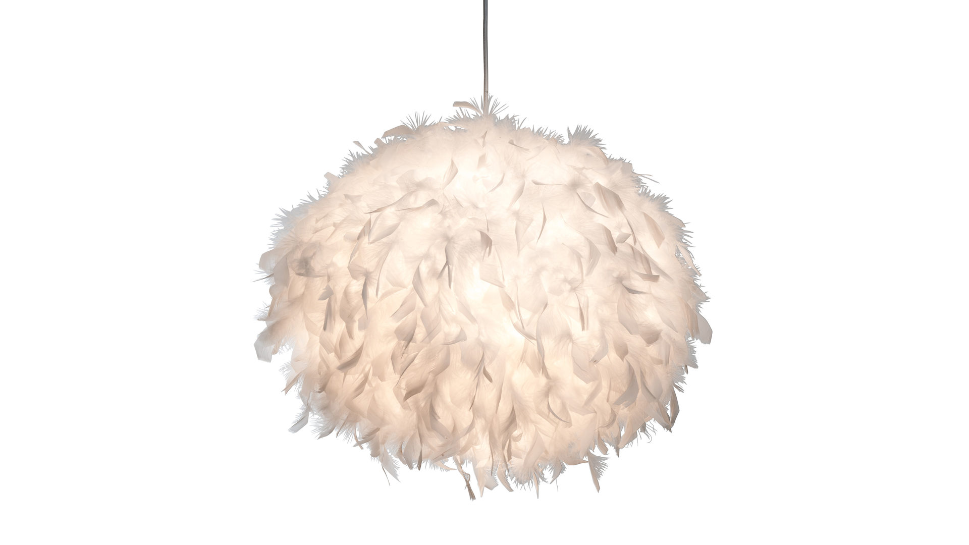 Am Pendel dieser Hängelampe schwebt eine im Durchmesser ca. 40 cm große Papierkugel im weißen Federkleid. Das außergewöhnliche Design dieses Wohnaccessoires ist schon ohne eigeschaltetes Licht ein echter Hingucker, mit Beleuchtung noch viel mehr. Dafür sorgen Sie mit einem Leuchtmittel E 27 mit maximal 40 Watt, das nicht im Lieferumfang enthalten ist.