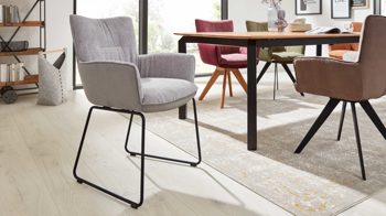 Außen weist der Esszimmerstuhl den Mikrofaserbezug Arizona und innen den Webstoffbezug Fantasy auf. Durch die Materialien und Farben präsentiert er sich zum einen robust, stabil und langlebig und zum anderen puristisch-elegant mit einer Prise Extravaganz.