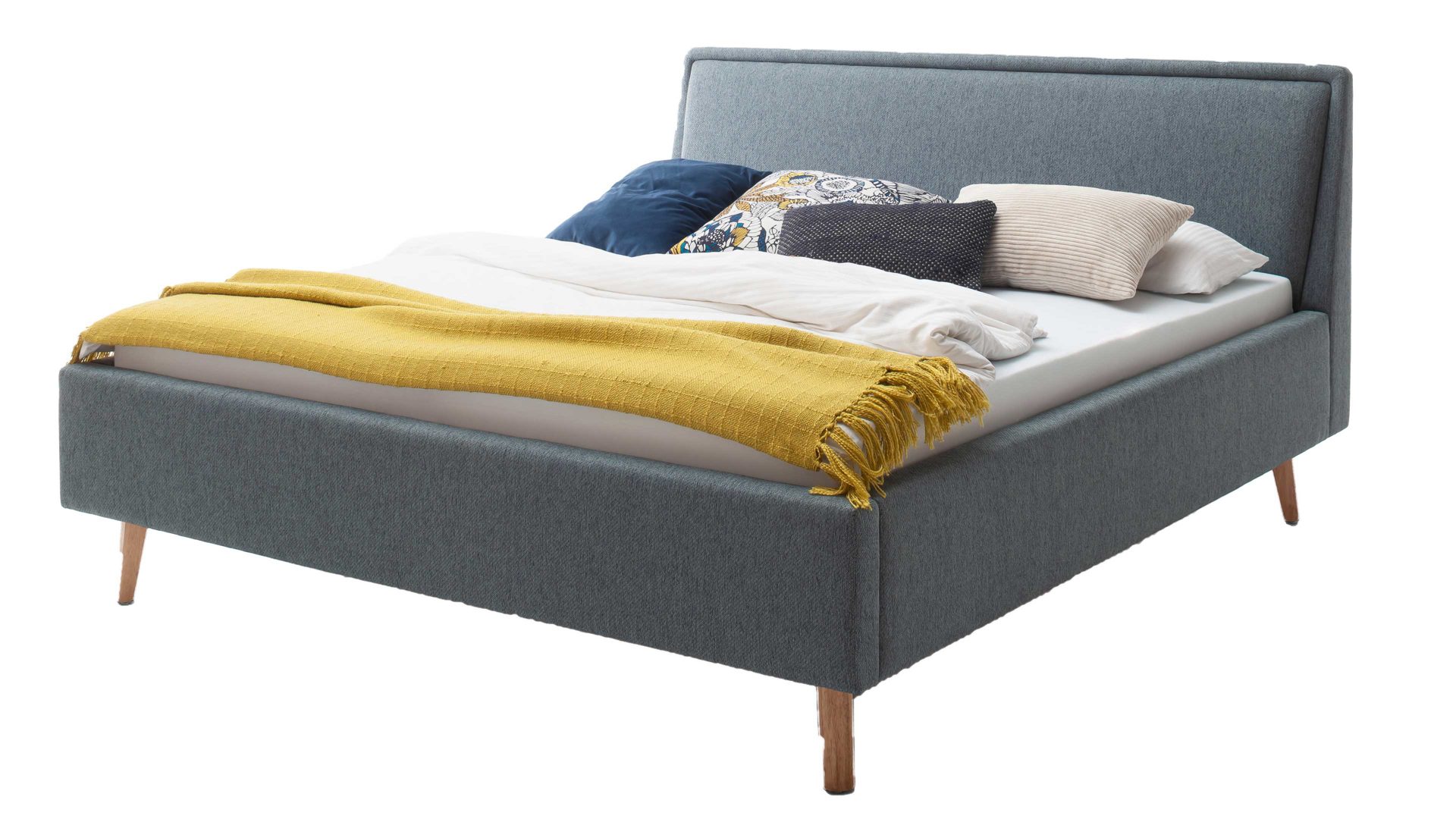 Das Polsterbettgestell Frieda mit Bettkasten verkörpert modernen Komfort. Mit dem oceanfarbenen Stoffbezug und den eichefarbenen Holzfüßen präsentiert es sich elegant und gemütlich designt. Die Bettseiten sind genauso wie das Polsterkopfteil glatt bezogen. Letzteres ist eine angenehm weiche Rückenlehne, wenn Sie abends im Bett vor dem Schlafen noch entspannt in Ihrem Buch lesen oder fernsehen möchten.