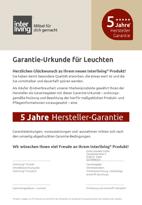 Die Interliving Leuchten Serie 9345 steht für durchdachtes Design, langlebige Materialien und präzise Technik. Die Leuchte entspricht der Energieeffizienzklasse E (Spektrum A bis G) und bietet 5 Jahre Herstellergarantie – ein starkes Versprechen für Qualität, Nachhaltigkeit und modernes Lichtambiente mit Stil.